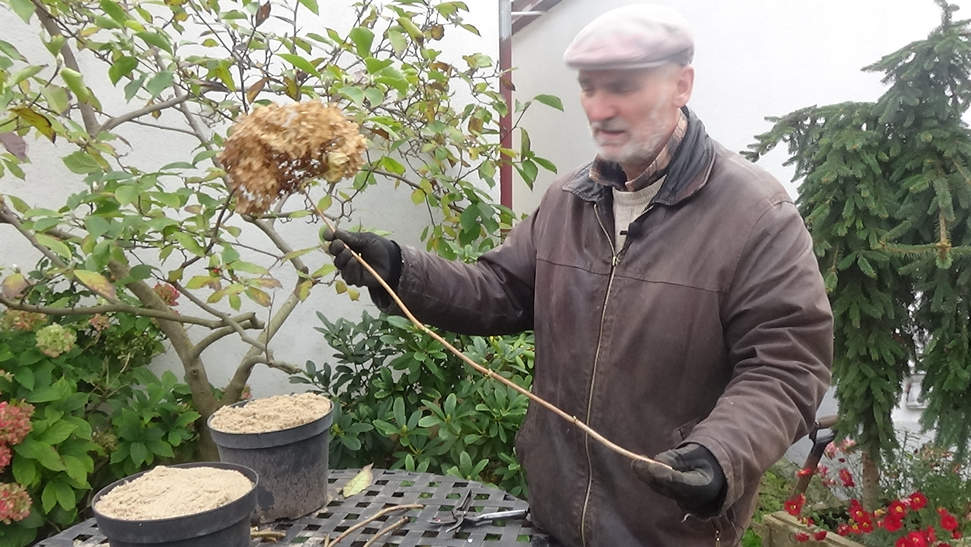 Mam tym razem pytanie dotyczące filmu ” Rozmnażanie Hortensji bukietowej cz. 1. ” – Co to za drzewko widoczne w tle za stolikiem, przy białej ścianie – takie dość nieregularne, widać kilka tylko powyginanych gałęzi z niedużą ilością liści, wygląda na owocowe i nie daje mi ono spokoju.